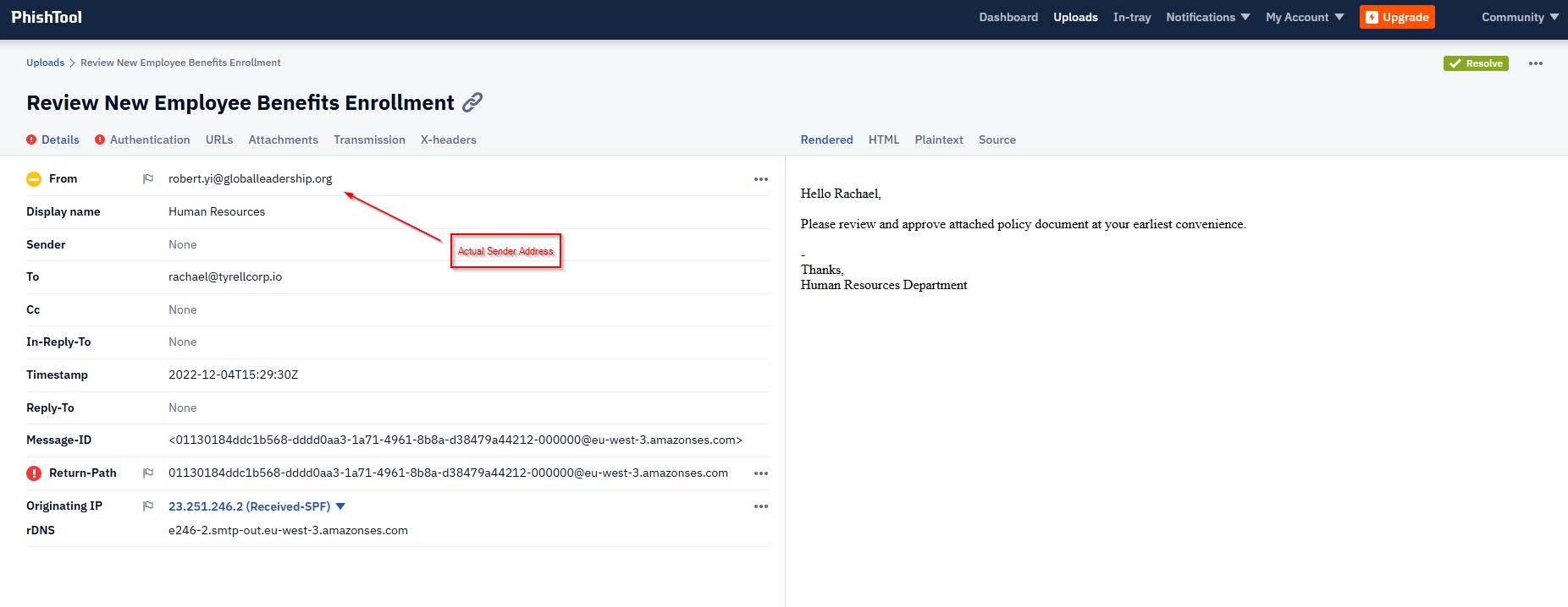 Upon loading the email file into Phishtool, we are given a ‘Details’ page about the email. The actual sender address can be found here: