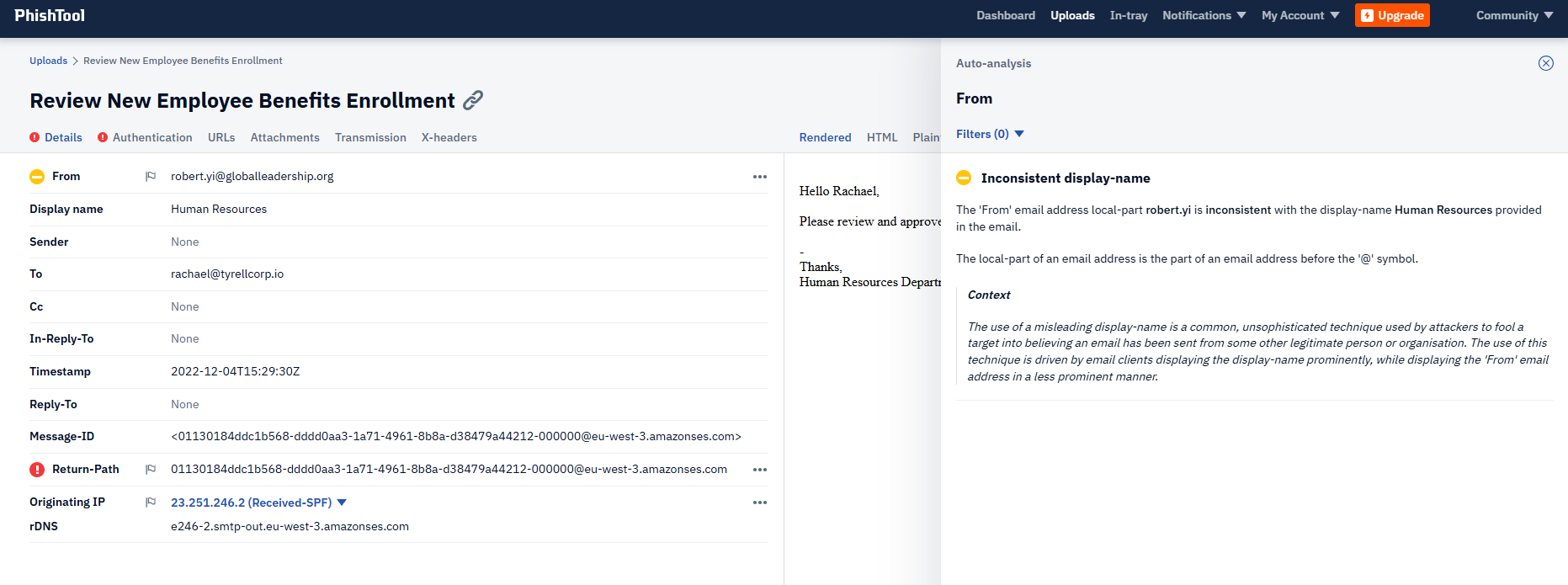 It is worth noting, by clicking on the little yellow icon next to ‘From’, we get an Auto-analysis explanation that the “From” Address is inconsistent with the display name.