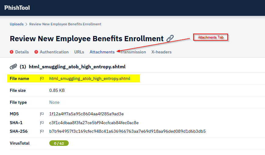 Navigating over to the “Attachments” tab, we get the attachment name, some hashes, and results from VirusTotal as well.