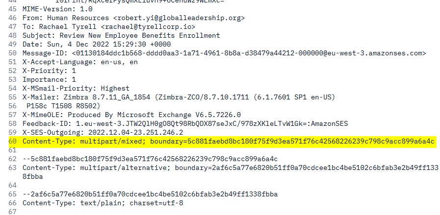 For this one, we go back to Phishtool and view the email source, scrolling down until we see the MIME section. Line 60 specifically contains our first boundary.