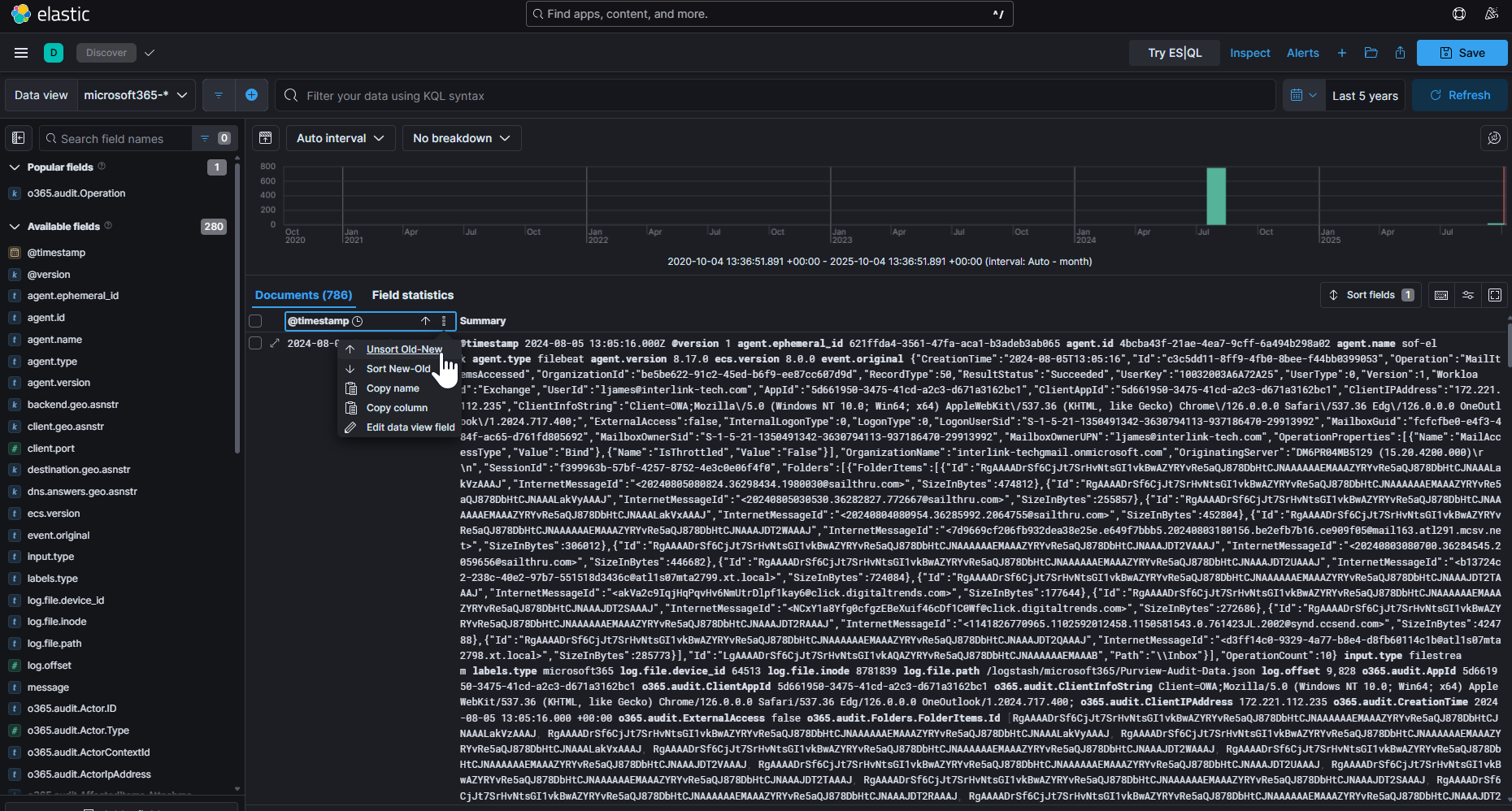 After accessing the web GUI, heading to the “Discover” tab, and setting my Data View to “microsoft365”, I sort th4e data by oldest to newest, and begin answering our questions: