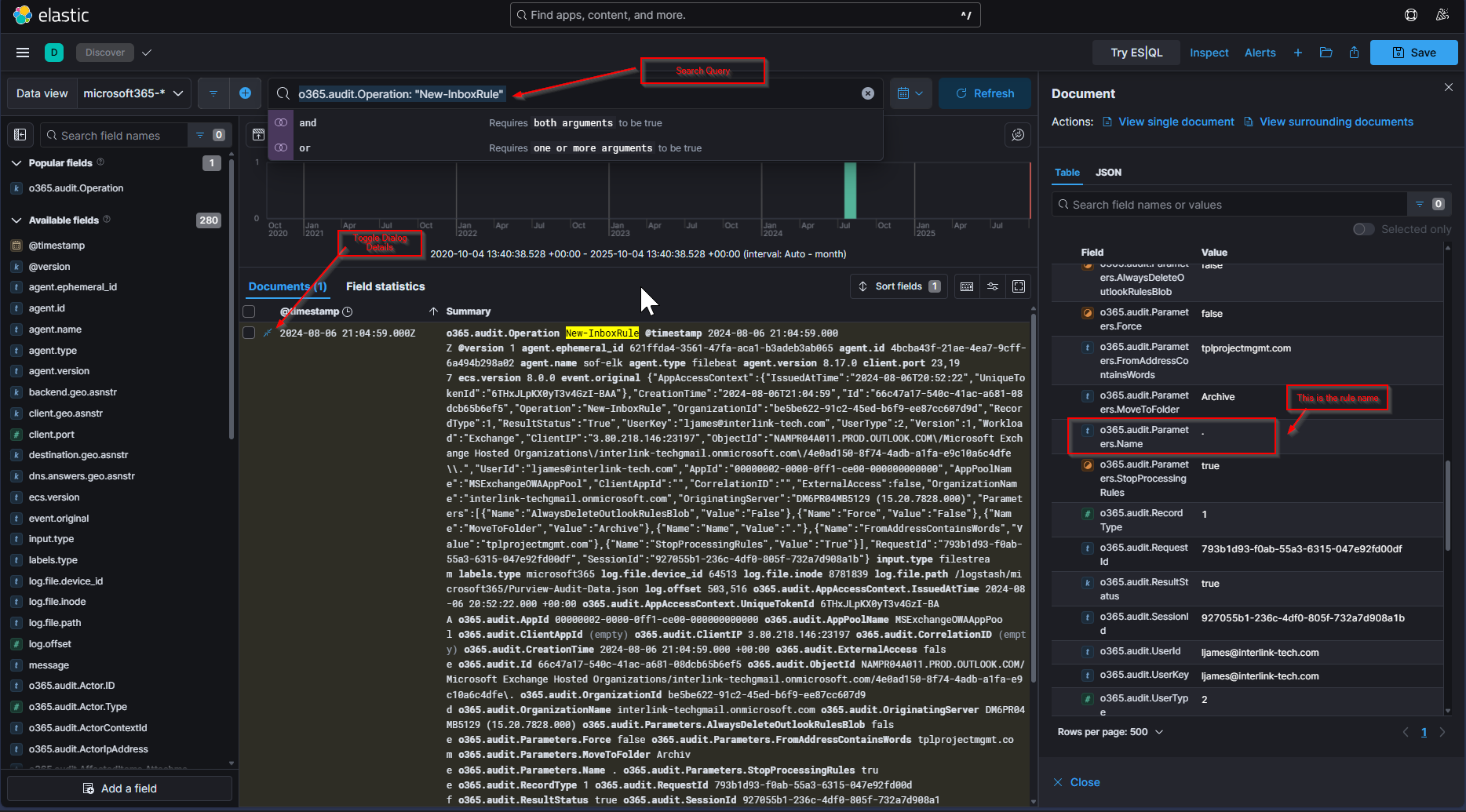 This yields me one result. I then toggle the “Dialog with Details”, and search for the ‘o365.audit.Parameter.Name’