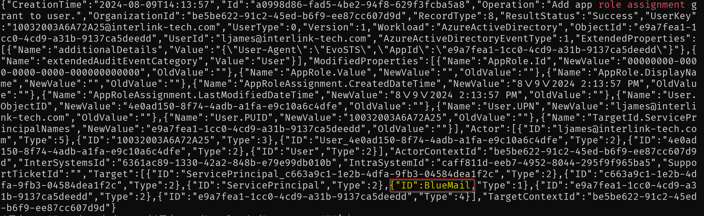 However, my SOF-Elk instance was misbehaving and completely neglected to parse this log. I instead used grep’d for the string ‘role assignment’ in the json file to find it. Sure enough it existed, and I was able to find the name of the application in there.