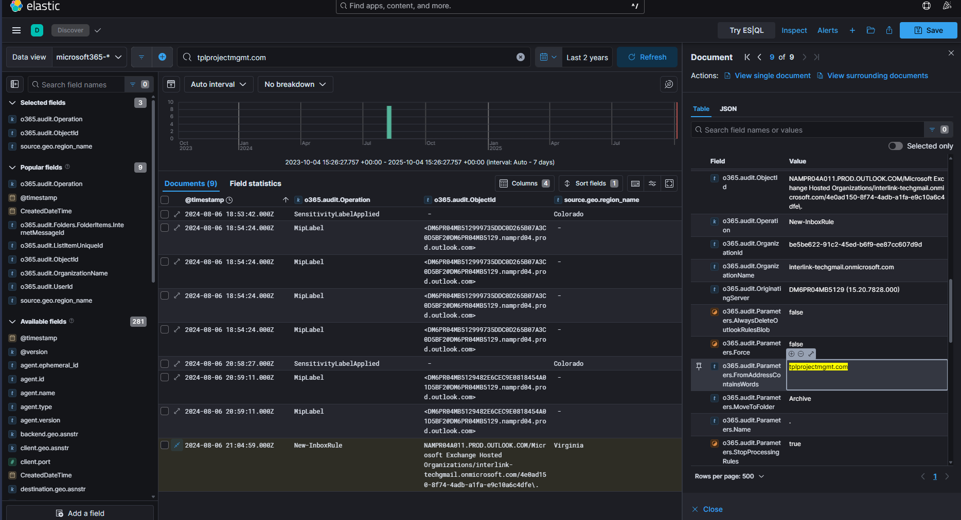If we look at the “Parameters.FromAddressContainsWords” section highlighted above, we can see the domain ‘tplprojectmgmt.com’ If we then conduct the search: