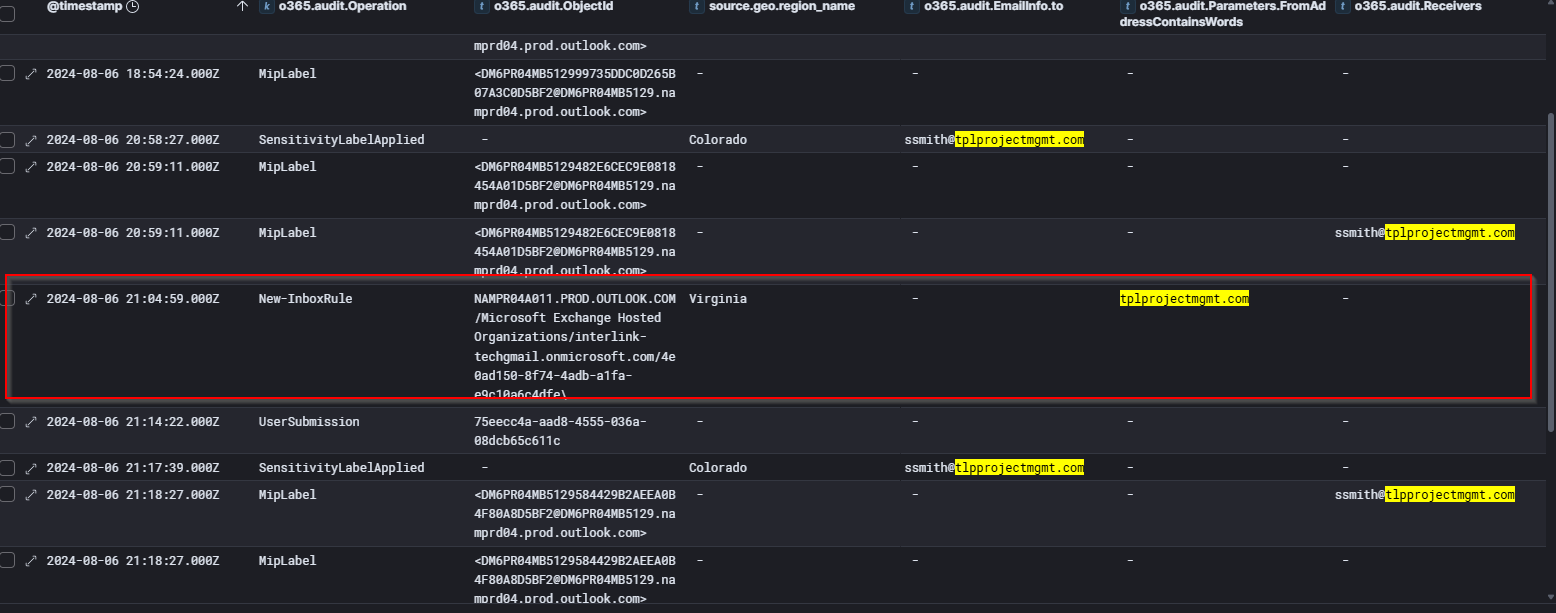 We find the domain “tlpprojectmgmt.com” having been flagged as a phish, but then categorized as not spam. If we then notice the chain of events surrounding the Inbox Rule: