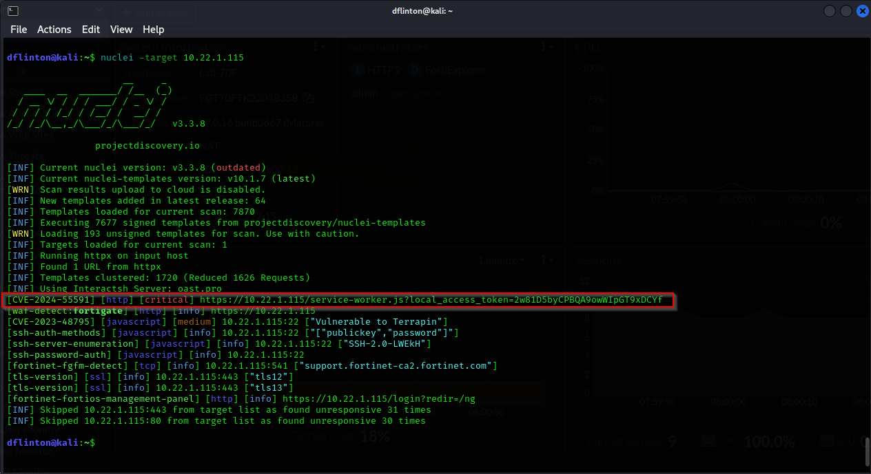 On my Attacker box (a Kali VM), I begin by launching a nuclei scan of my FortiGate: