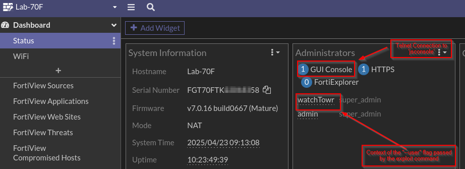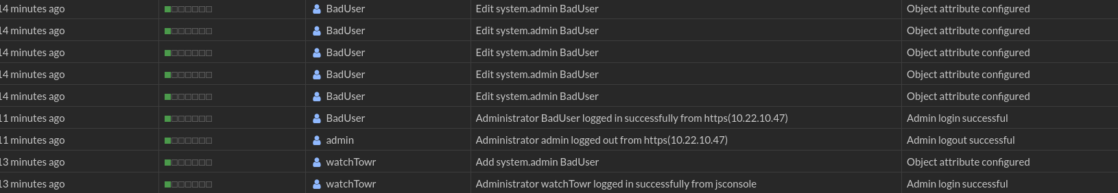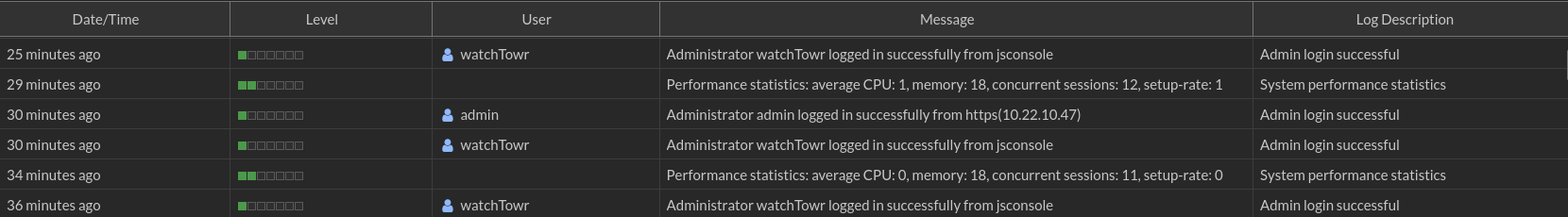 We can see watchTowr is signed in as a super admin to the “GUI Console” in reference to the “jsconsole”. And if we look at the system logs, we can see the logins from the “watchTowr” account (I ran the exploit a few times while testing).