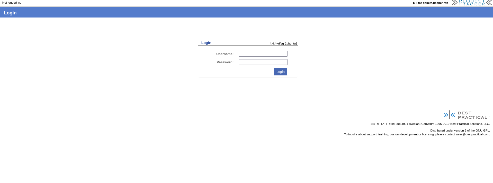 This login page is for RequestTracker 4.4.4, as it states in the lower right corner. A quick google search does not really reveal anything in the way of vulnerabilities, but I am able to find default credentials for the program, which is always worth trying. The default creds are root:password. With this, I am successfully logged in to RequestTacker!