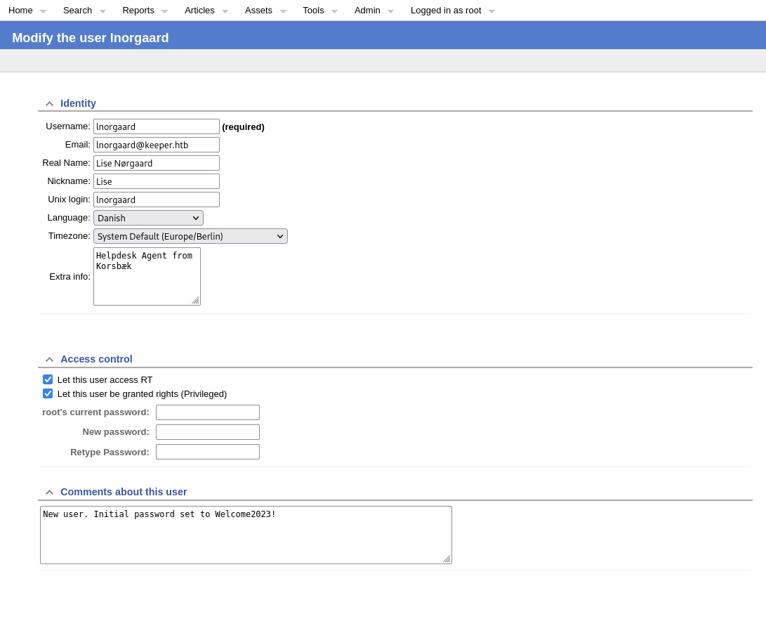 Poking around a bit, I find a ticket in queue for an “Issue with KeePass Client on Windows”. The user assigned to the case is ‘Lise Norgaard’, and the ticket notes state that there was a crash dump attached to the ticket. Lise then comments back a bit later that they removed the crash dump and saved it to their local home directory for further investigation. This seems like enough of a hint that Lise is likely our target for initial access. So I will dig around the console in an attempt to find more useful information about our friend Lise.