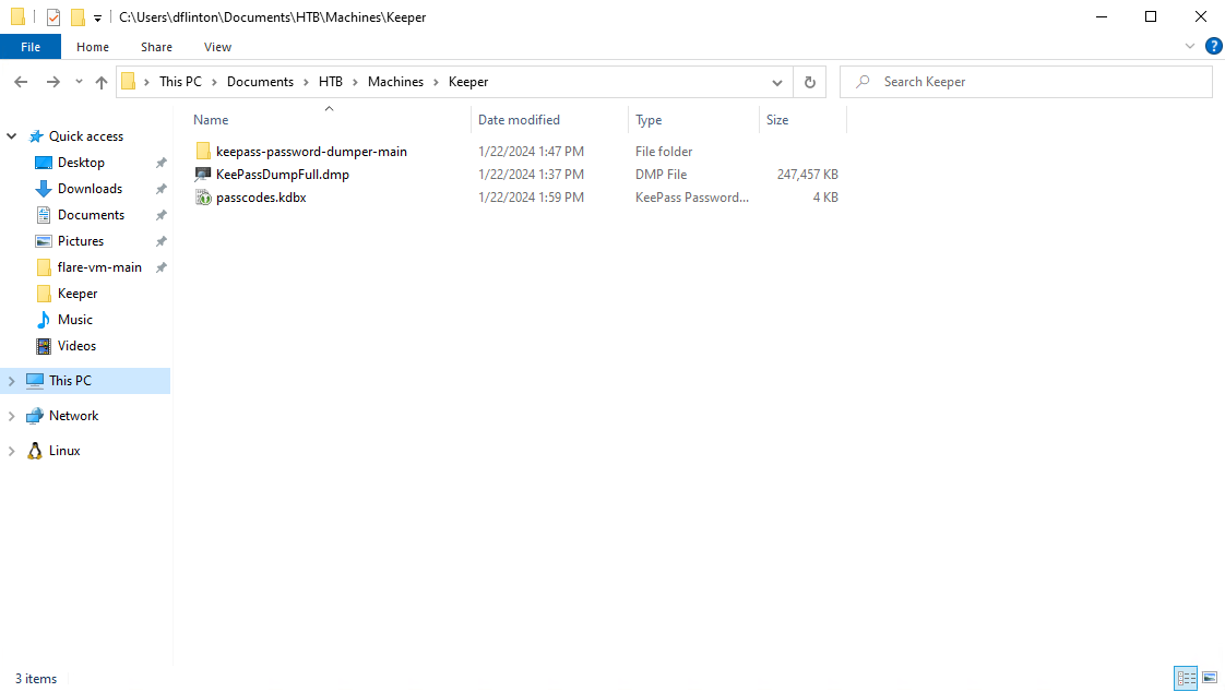 Looks like this is the crash dump file that was outlined in the ticket, as well as the whole KeePass database contained in the passcodes.kdbx. I’m going to go ahead and exfiltrate that to my local machine for further inspection.