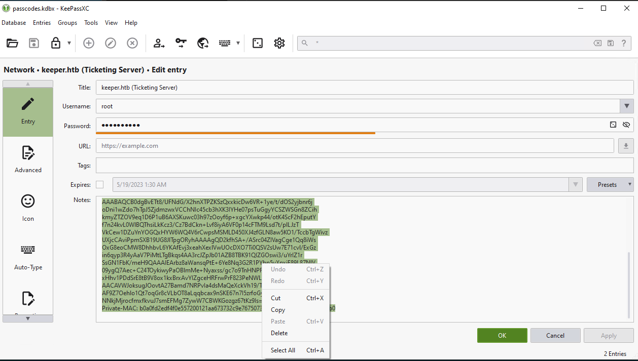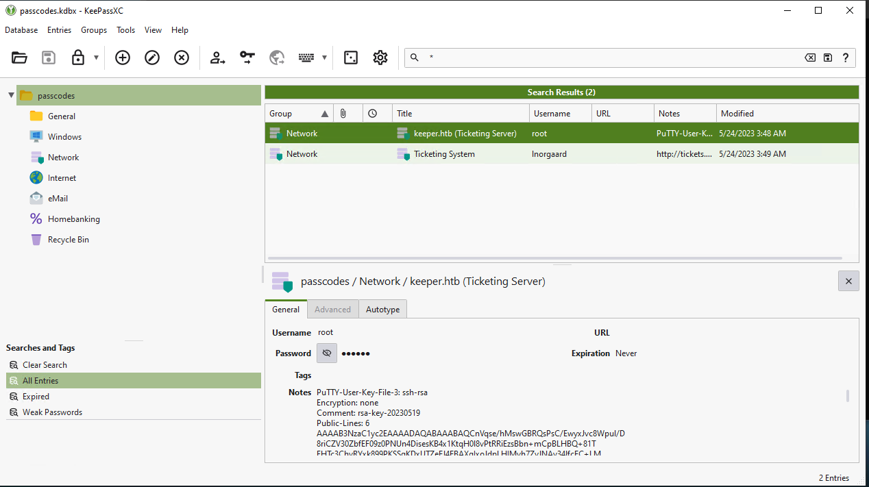 Sure enough, that master password worked and I was able to load in the passcodes.kdbx file into the fresh instance of KeePass. Here I find what appears to be root credentials to the Ticketing Server, with a note that it is in PuTTY format.