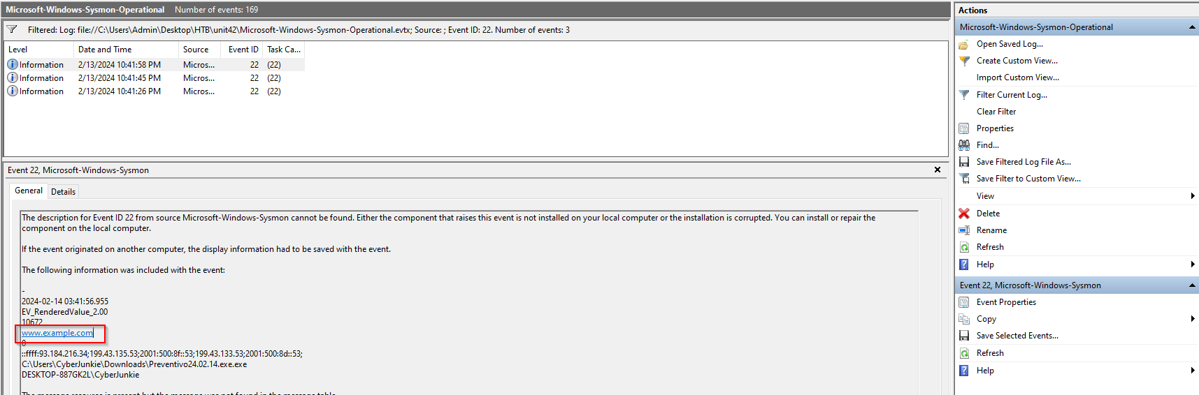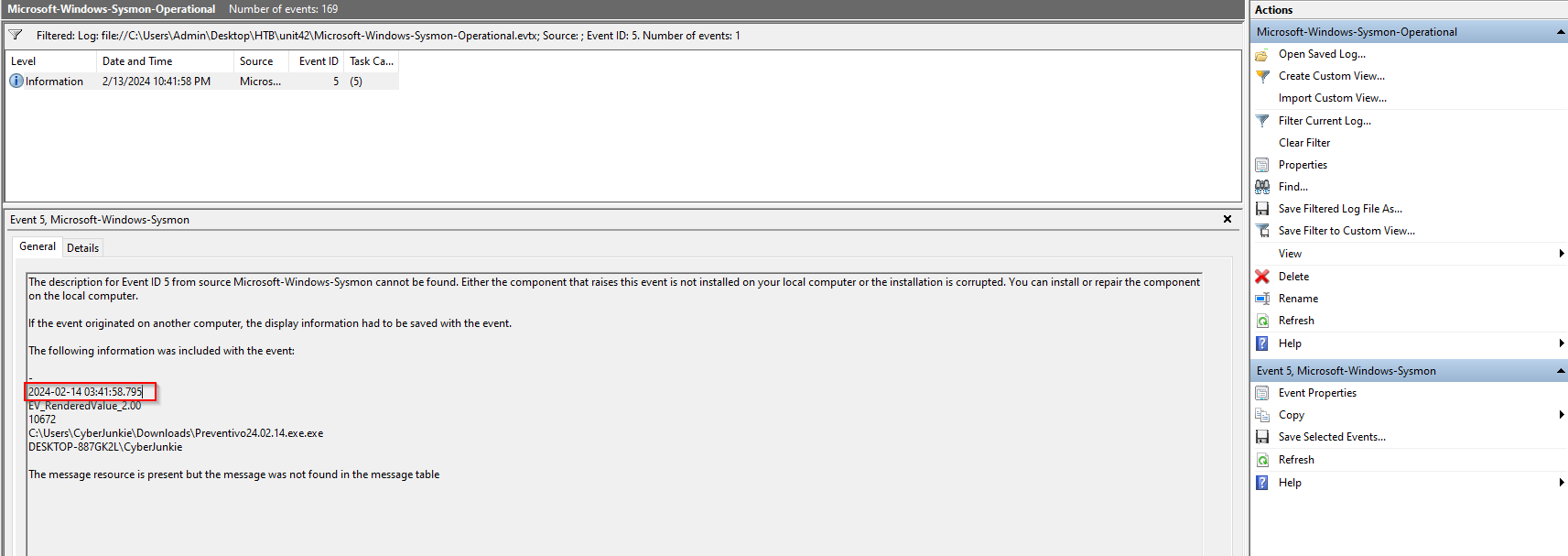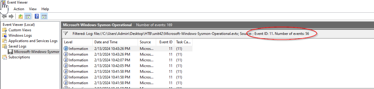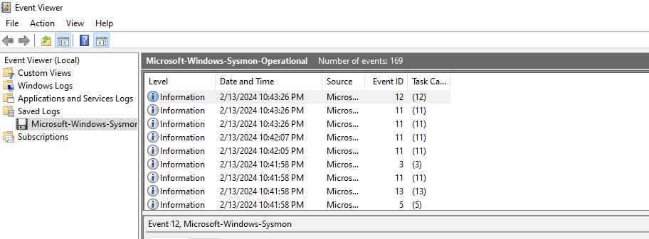 Double clicking it opens it in Windows EventViewer, where it is likely the majority of this exercise will be conducted. Right off the bat, I can see this file contains 169 events.