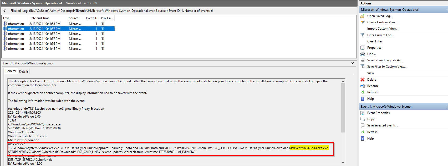 This being said, I am going to filter on Event ID 1. Doing so gives me 6 results, which I will comb through manually. The second result seems to give an interesting clue:
