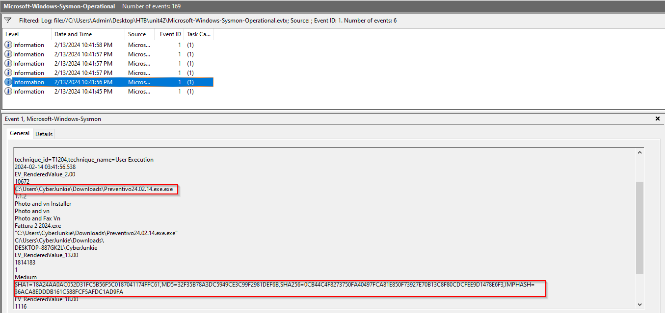 Quite frankly, that whole command looks suspicious, but the Preventivo24.0.2.14.exe.exe really sticks out to me. Exploring a little further, I see the executable appear in the 5th result, including it’s full file path and several identifying hashes.