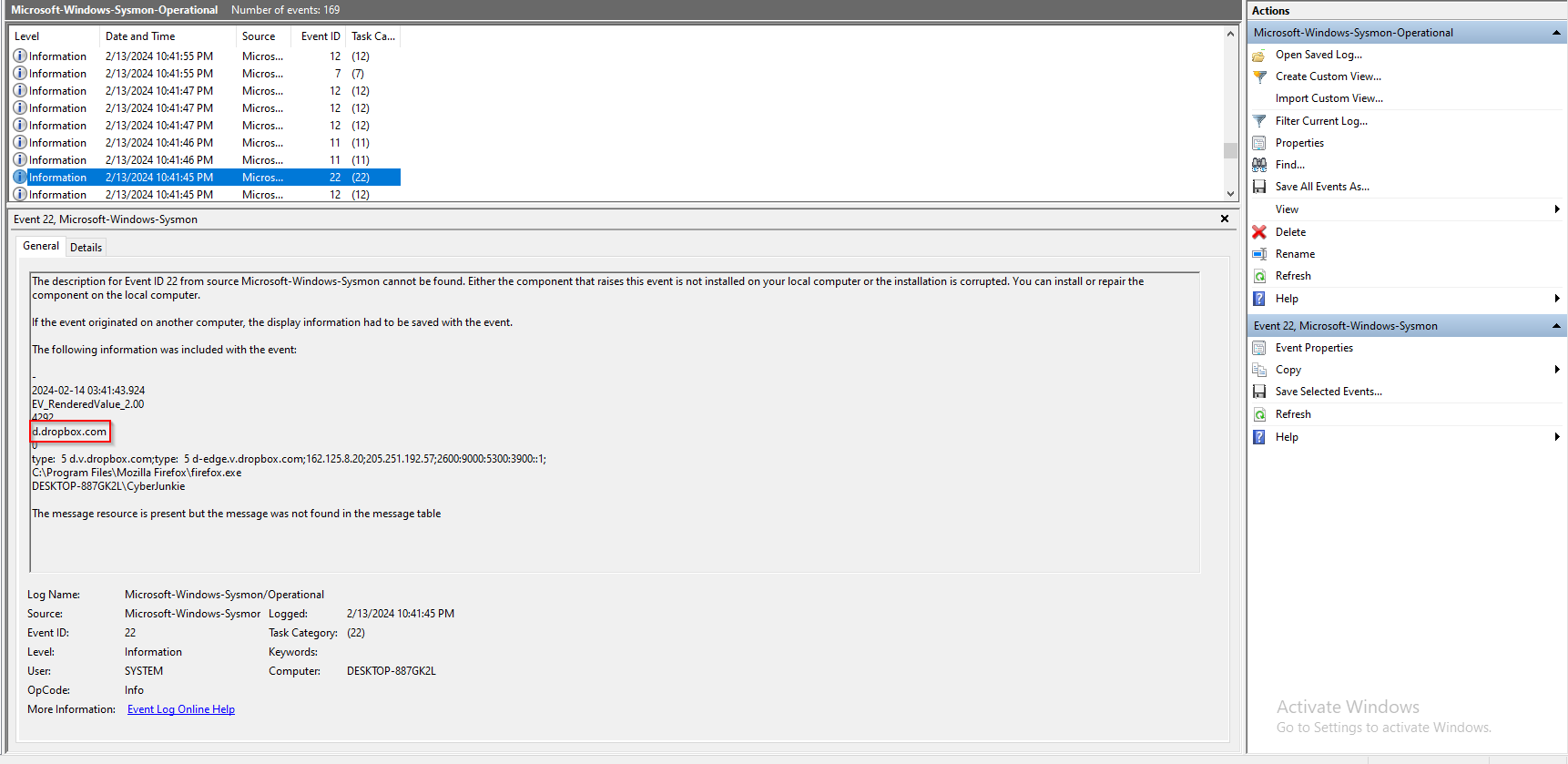 Sysmon Event ID 22 can be used to analyze DNS queries made by the system. If I combine this with the knowledge of the malware execution, I can likely discern where it was downloaded from by using temporal proximity, or the closeness in time of the two events. Searching for an Event ID 22 prior to execution, we find DNS queries to Dropbox, which would align with the question being asked.
