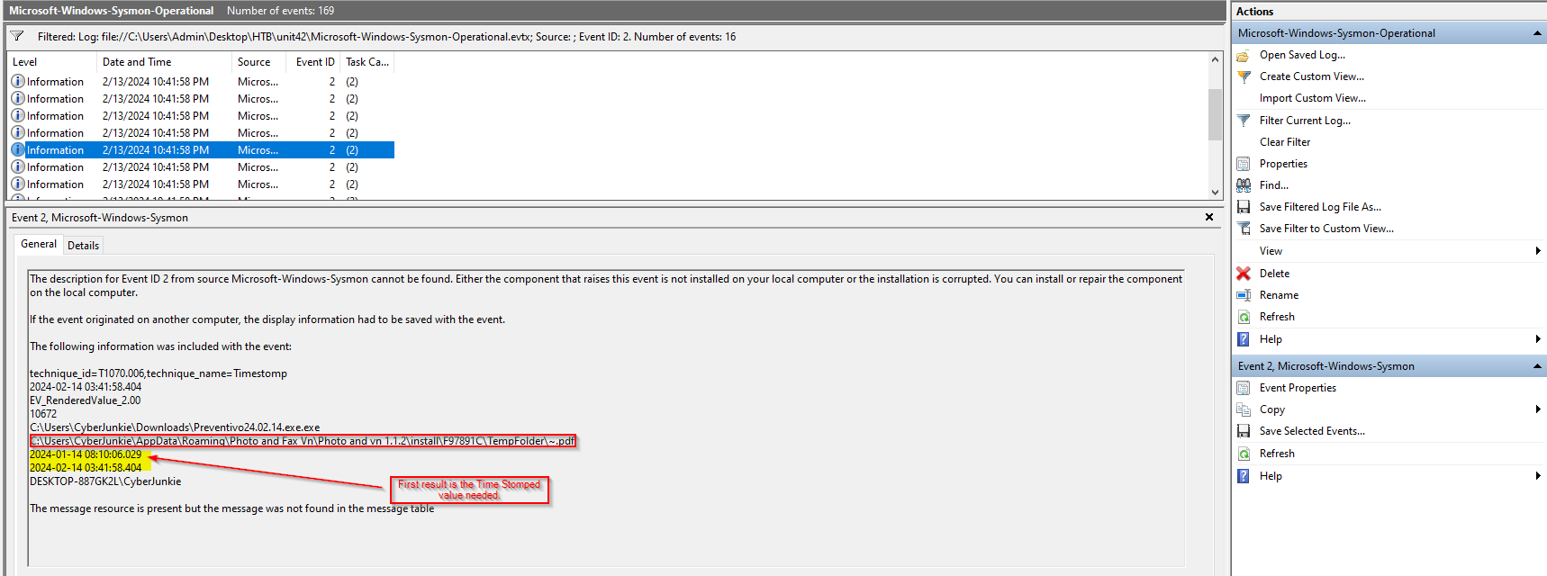 Time Stomping can be identified by Event ID 2. Simply filtering the events by Event ID 2 produces 16 results. Scrolling through them all, there is only 1 that mentions a .pdf file, so this must be the log I need.