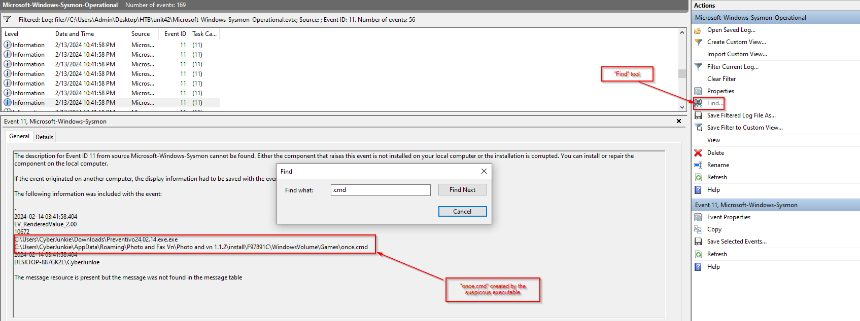 Event ID 11 is used for “File Creation” operations, so I will filter on that and simply use the “Find” tool to search for .cmd, and choose the log with the malicious executable as the parent.