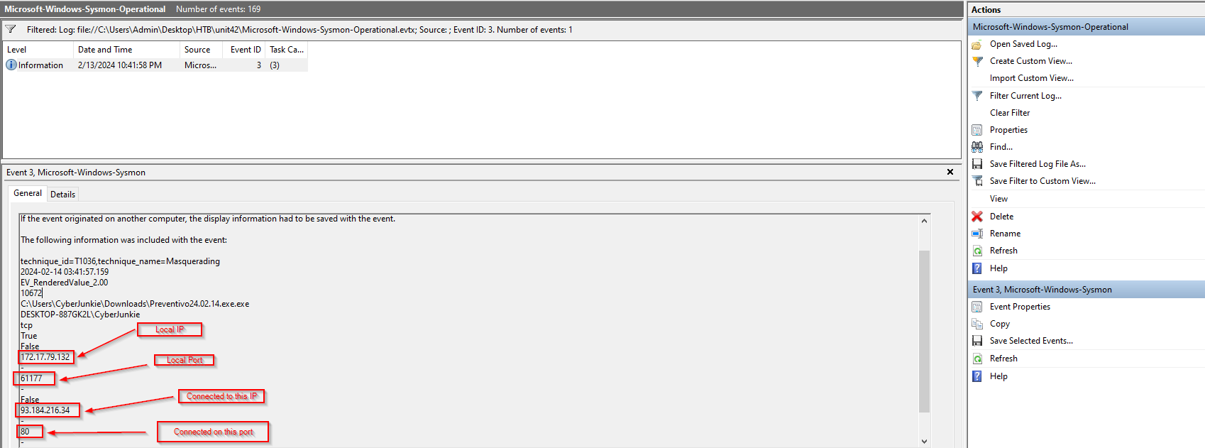 This can be found by filtering on Event ID 3, which is the Event ID for Network Connections. Filtering on this only results in one log, which should make finding the answer pretty easy.