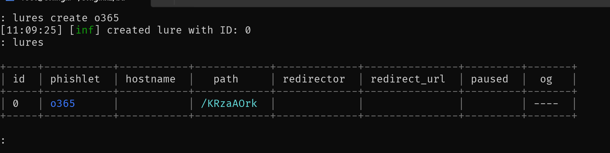 Once the Microsoft 365 phishlet is enabled, a lure needs to be created. A lure allows Evilginx to generates a phishing URL that attackers could embed in emails or malicious websites. An example might look like this:
